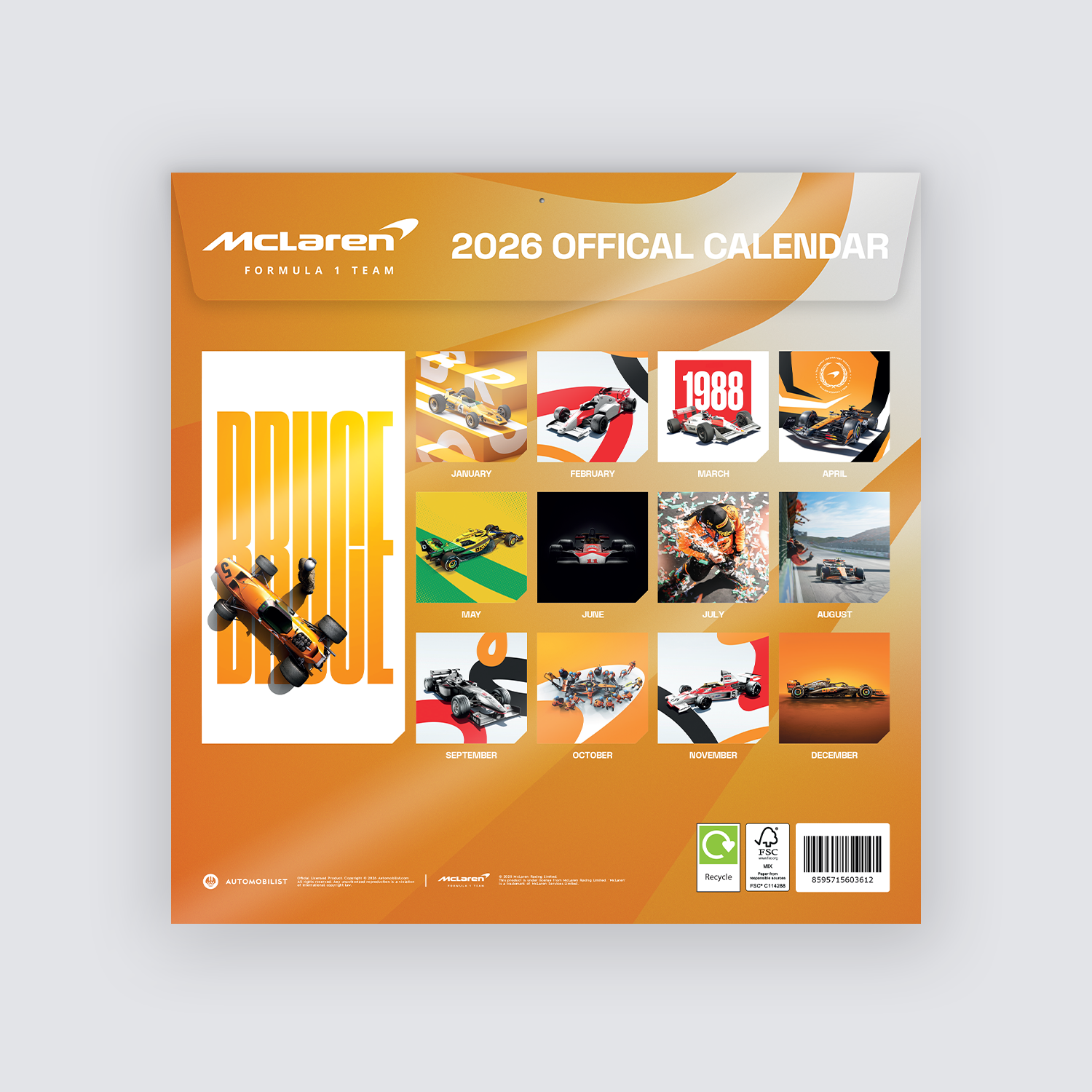 Vive la emoción de la temporada 2026 de Fórmula 1® con el calendario oficial del equipo McLaren F1. Este compañero esencial para todo amante del automovilismo reúne todas las carreras, ubicaciones y eventos clave en un diseño espectacular, con licencia oficial F1® y el icónico color papaya de McLaren.