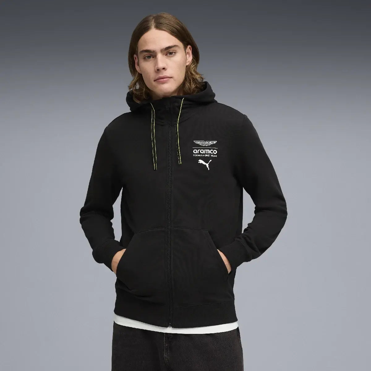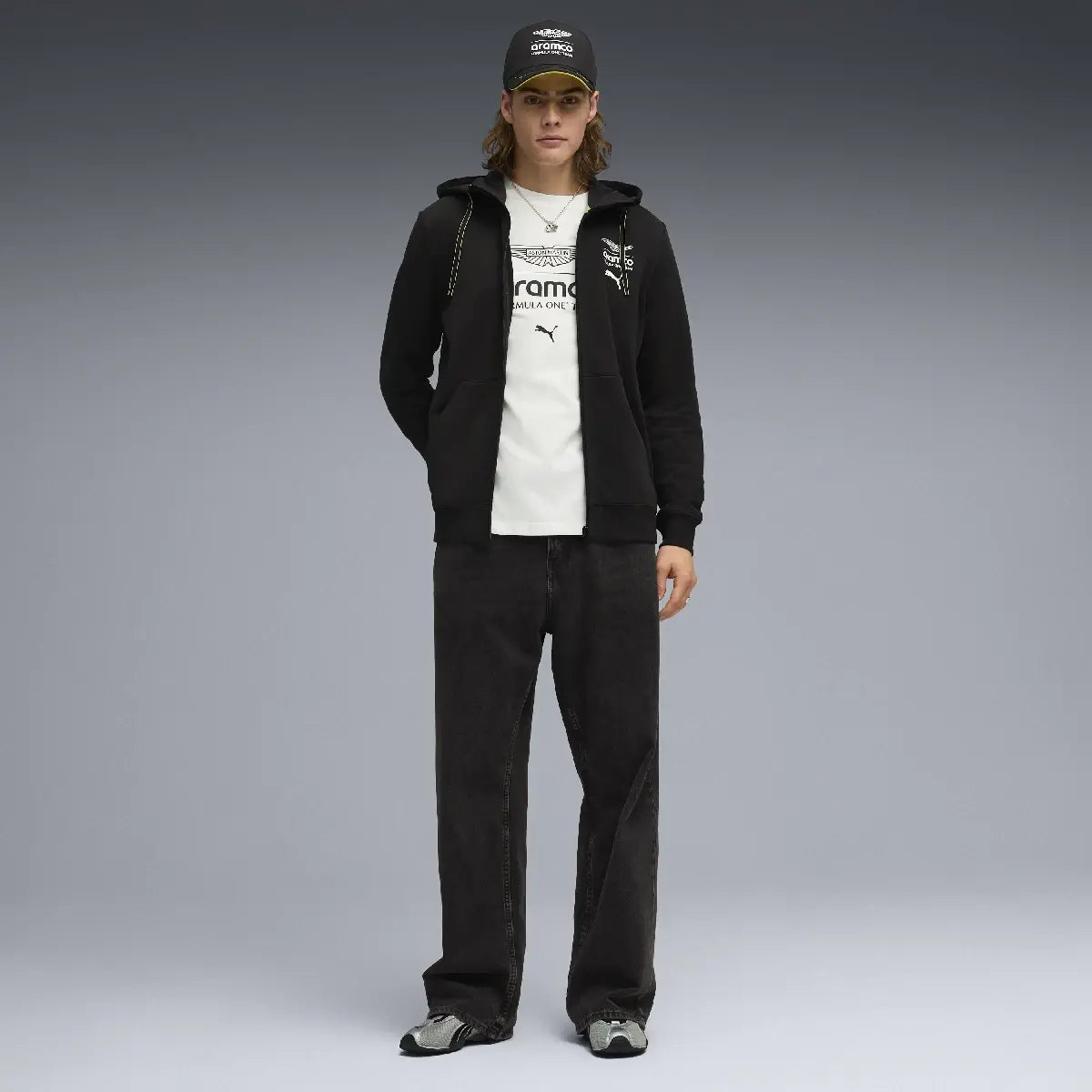 Renueva tu armario con la nueva colección ESS de Aston Martin, que presenta la exclusiva marca AMF1 impresa en el frente combinada con el logo de PUMA Cat debajo.